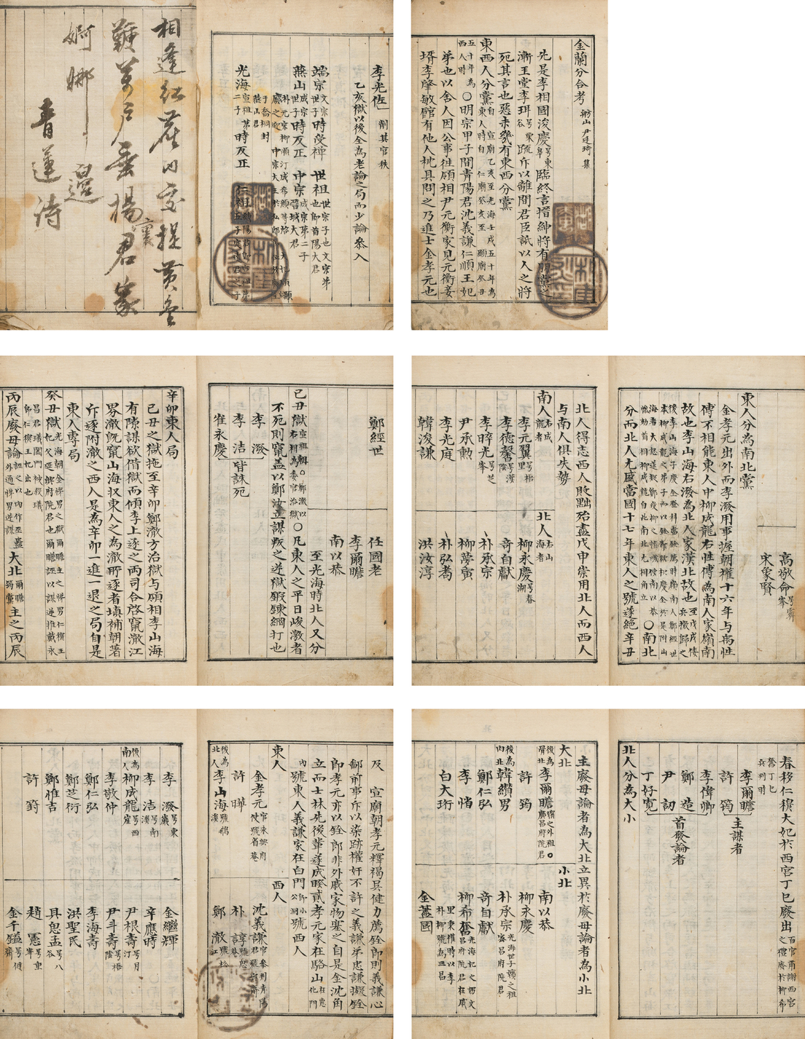책의 첫머리에는 ‘금란분합고金蘭分合考’라는 제목이 적혀 있고, 그 아래에 ‘방산 윤정기 집舫山 尹廷琦 集’이라고 쓰여 있다.이어 사림 세력이 동인과 서인으로 갈라서기 직전, 붕당의 폐해를 예견하고 이를 경고하였던 이준경李浚慶(1499-1572)을 언급하며 서술이 시작된다. 이어 사림이 동인東人과 서인西人으로 나뉘고, 다시 동인이 남인南人과 북인北人으로, 북인이 대