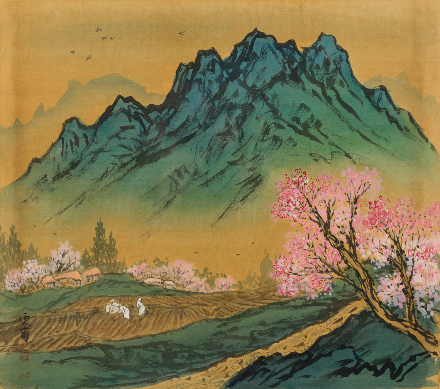 비단에 수묵담채